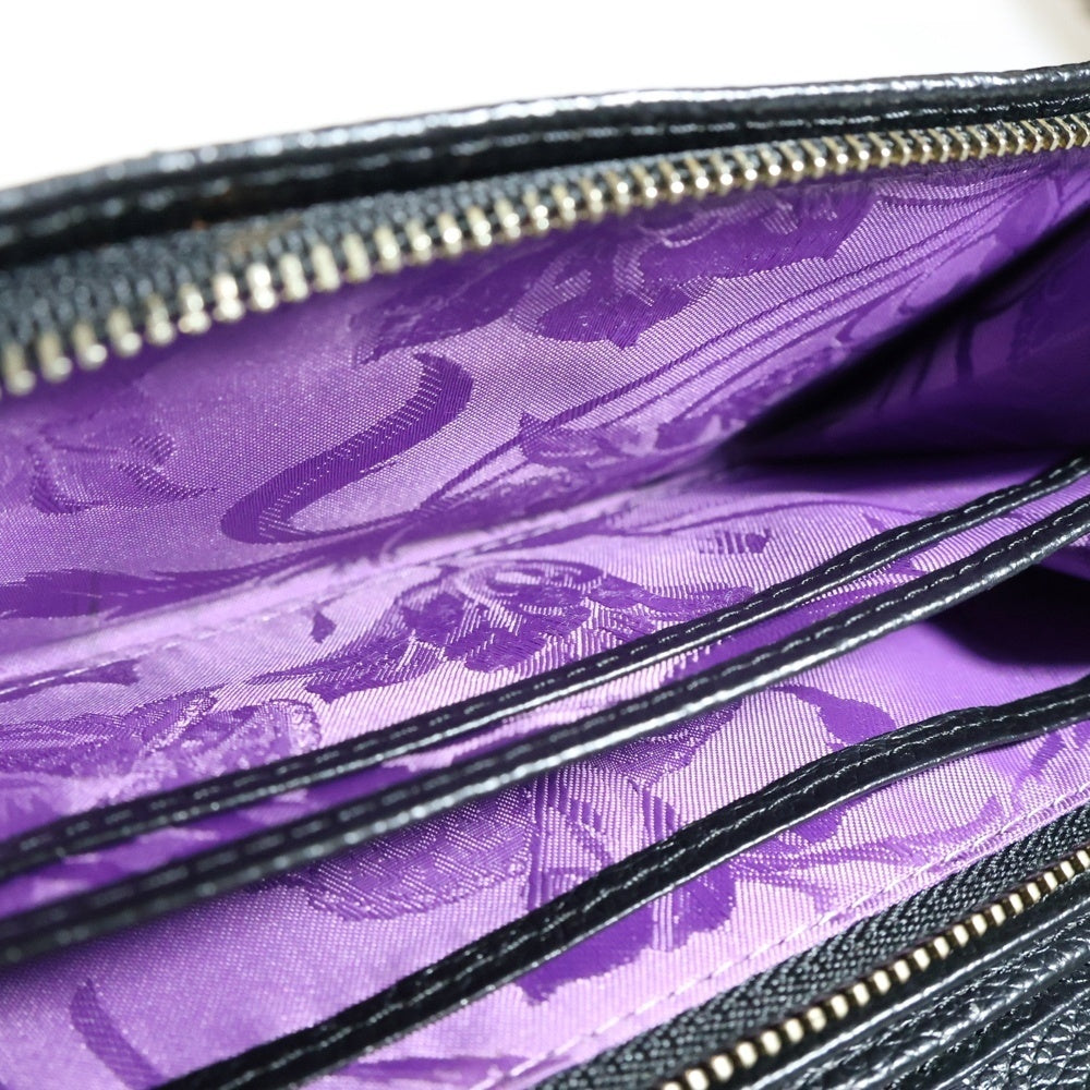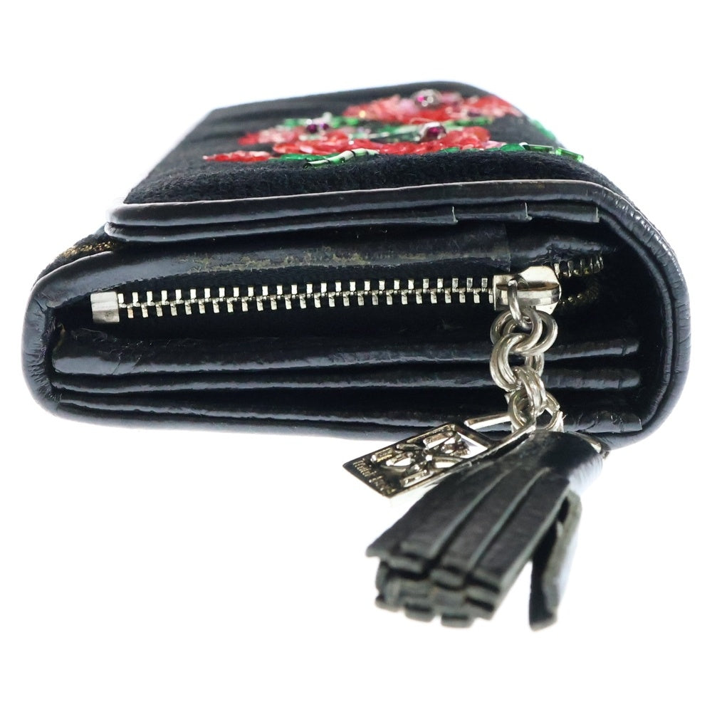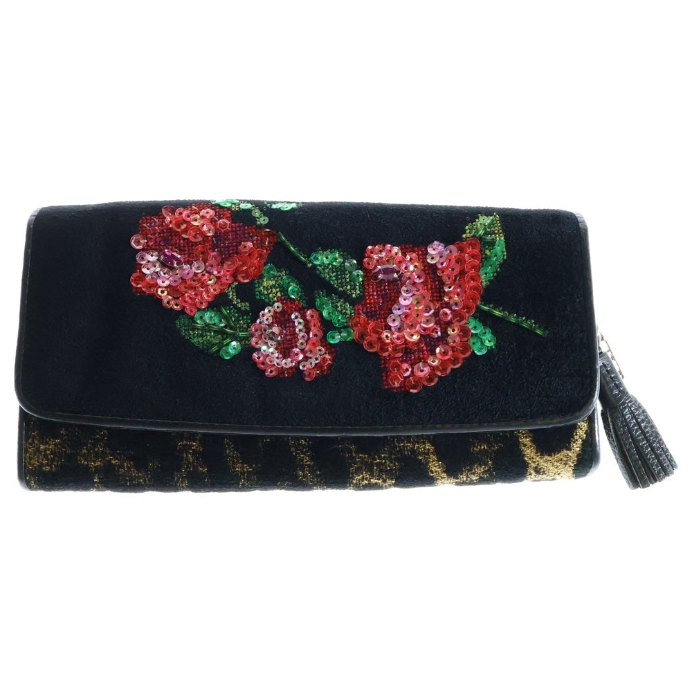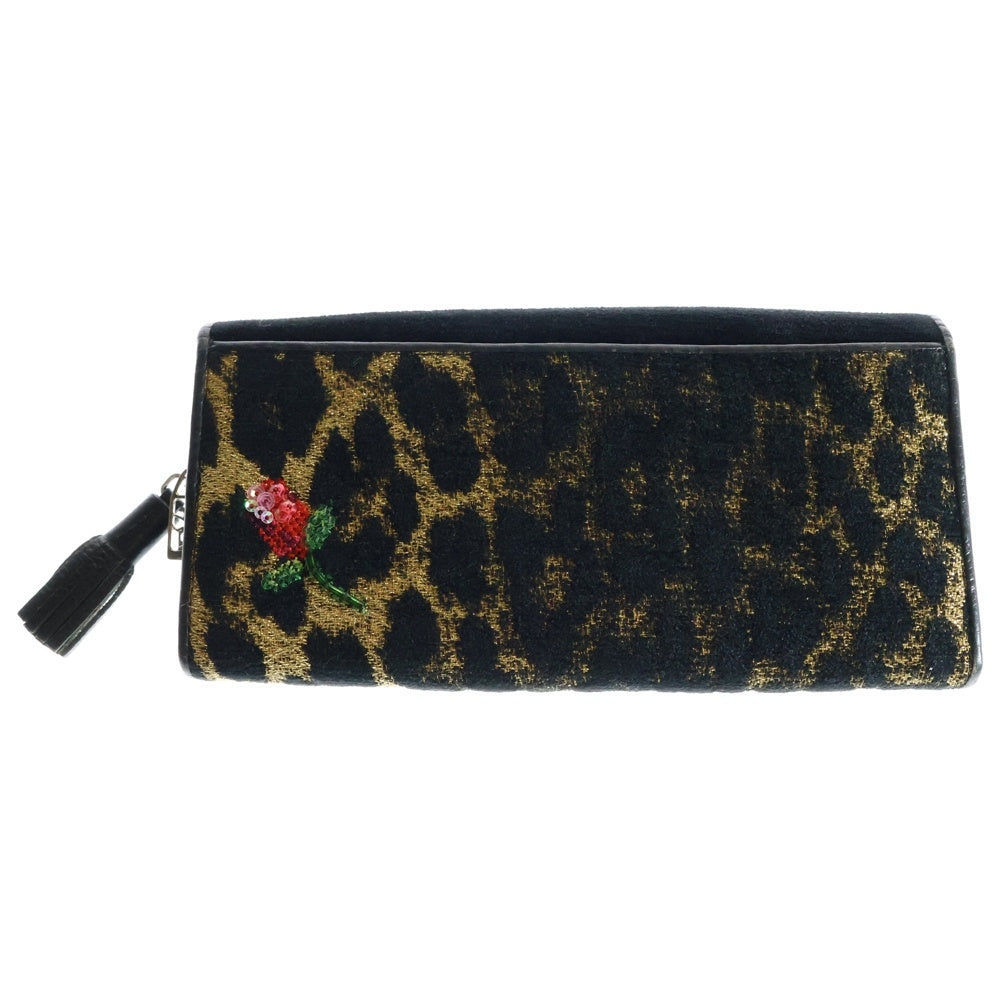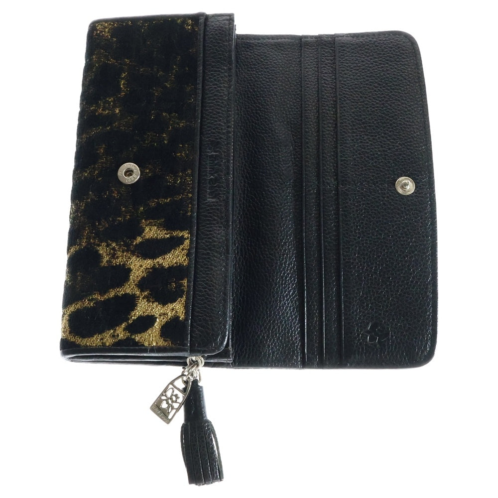 NO BRAND(ノーブランド) Think Bee! シンクビー スパンコール フラワー刺繍 ヒョウ柄切り替え パイル ジャガード レザー ロングウォレット 長財布 ブラック レディース