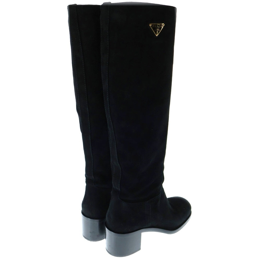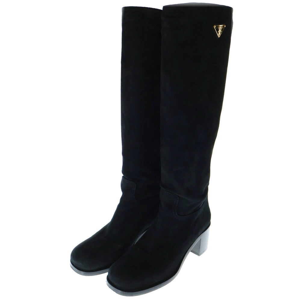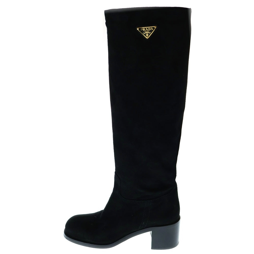 PRADA(プラダ) トライアングルロゴプレート スウェードレザー ヒール ロングブーツ ゴールド金具 ブラック レディース