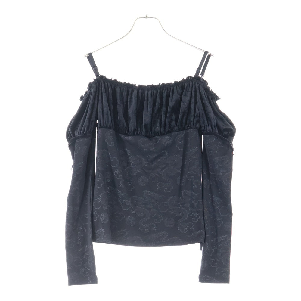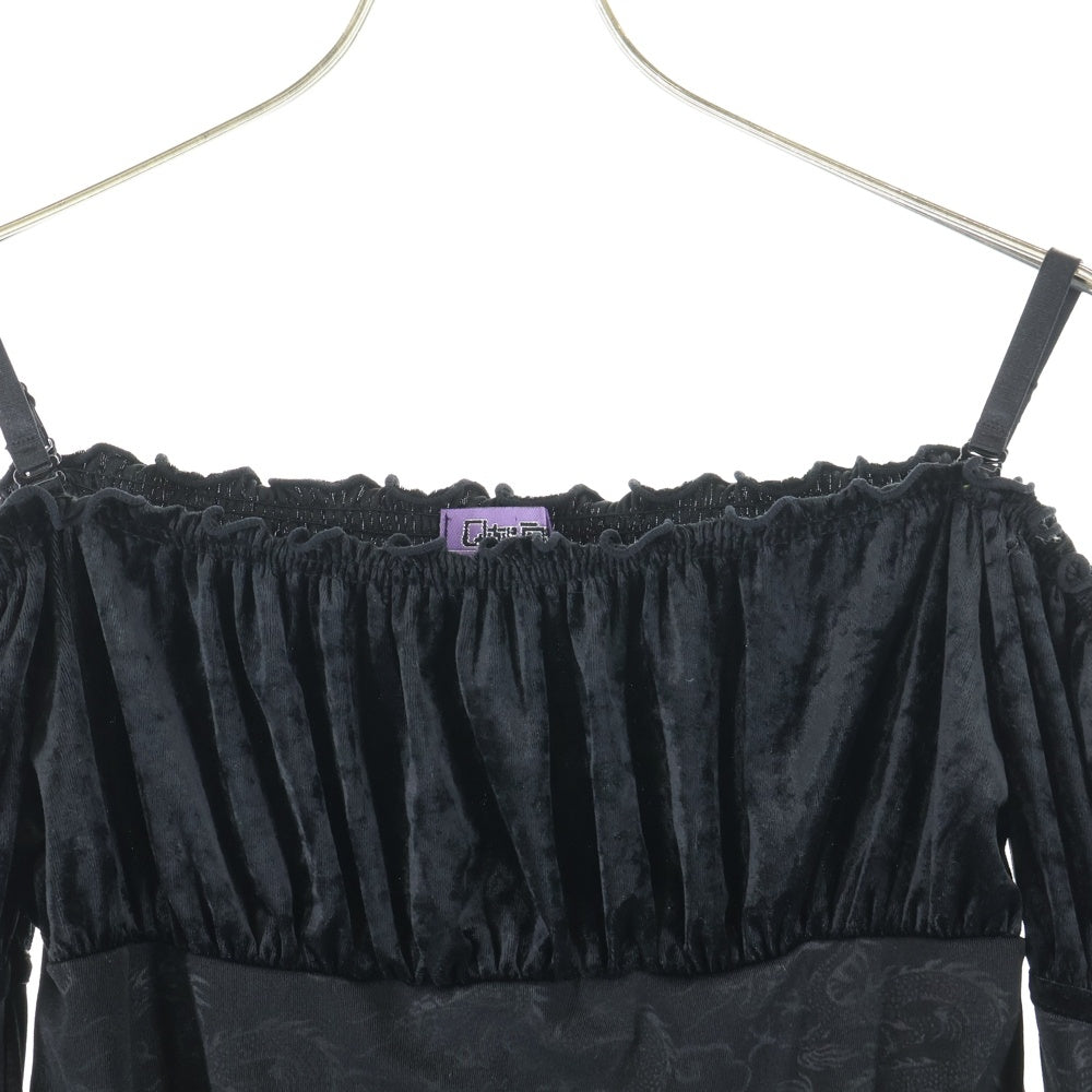 NO BRAND(ノーブランド) Qutie Frash キューティーフラッシュ ドラゴン柄切り替え ベロア ベルベット ギャザー 長袖 キャミソール トップス ブラック レディース