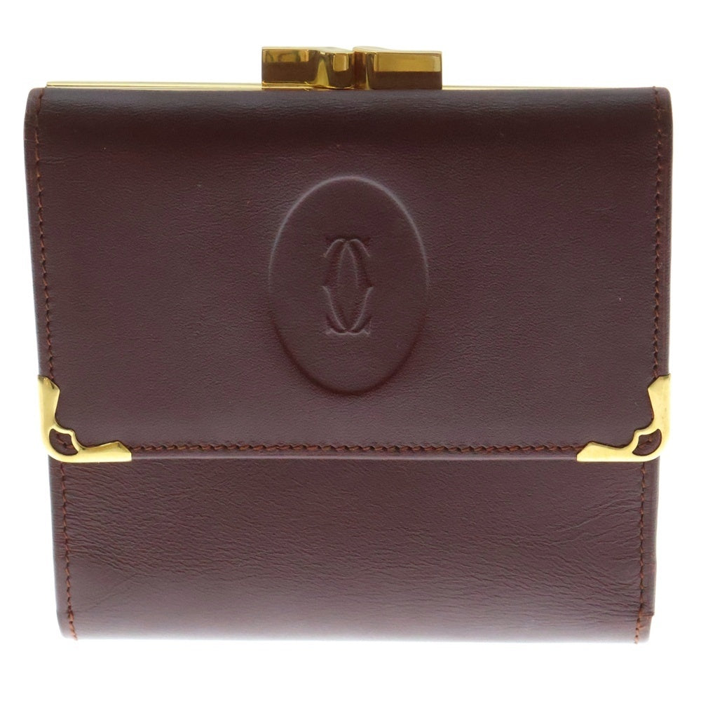 Cartier(カルティエ) エンボスロゴ カーフレザー がま口 コンパクトウォレット 二つ折り財布 ゴールド金具 ボルドー 〇